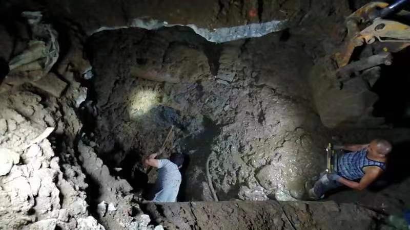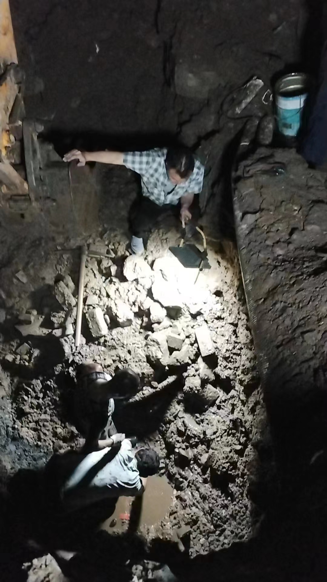 他們跳入3米深坑,利用鍬、鏟等工具進(jìn)行挖掘。施工中多次出現(xiàn)塌方,搶修工作艱難進(jìn)行,當(dāng)挖至4米多深時(shí)終于發(fā)現(xiàn)漏點(diǎn)并及時(shí)修復(fù)。在修復(fù)試水過程中,東都屹景中區(qū)DN110管線也發(fā)生破裂。當(dāng)時(shí)已經(jīng)是10日早6點(diǎn),搶修人員已連續(xù)工作16個(gè)小時(shí)。夏日炎炎,為確保施工人員安全,處領(lǐng)導(dǎo)指揮現(xiàn)場二隊(duì)、三隊(duì)維修人員立即撤離,調(diào)派維修一隊(duì)繼續(xù)施工,6小時(shí)后修復(fù)漏點(diǎn),恢復(fù)供水。